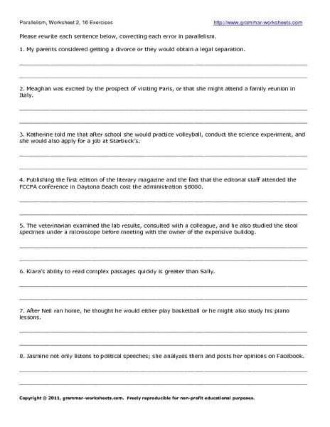 Smoking and ____ are both prohibited on the subway. Worksheets are parallelism practice rewrite these incorrect sentences in, parallelism exercises,. This is the parallel structure worksheets section.